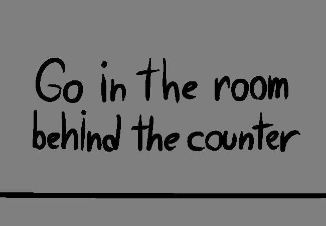 You examine the writing on the wall, which says "Go in to room behind the counter". You might as well do what it says.